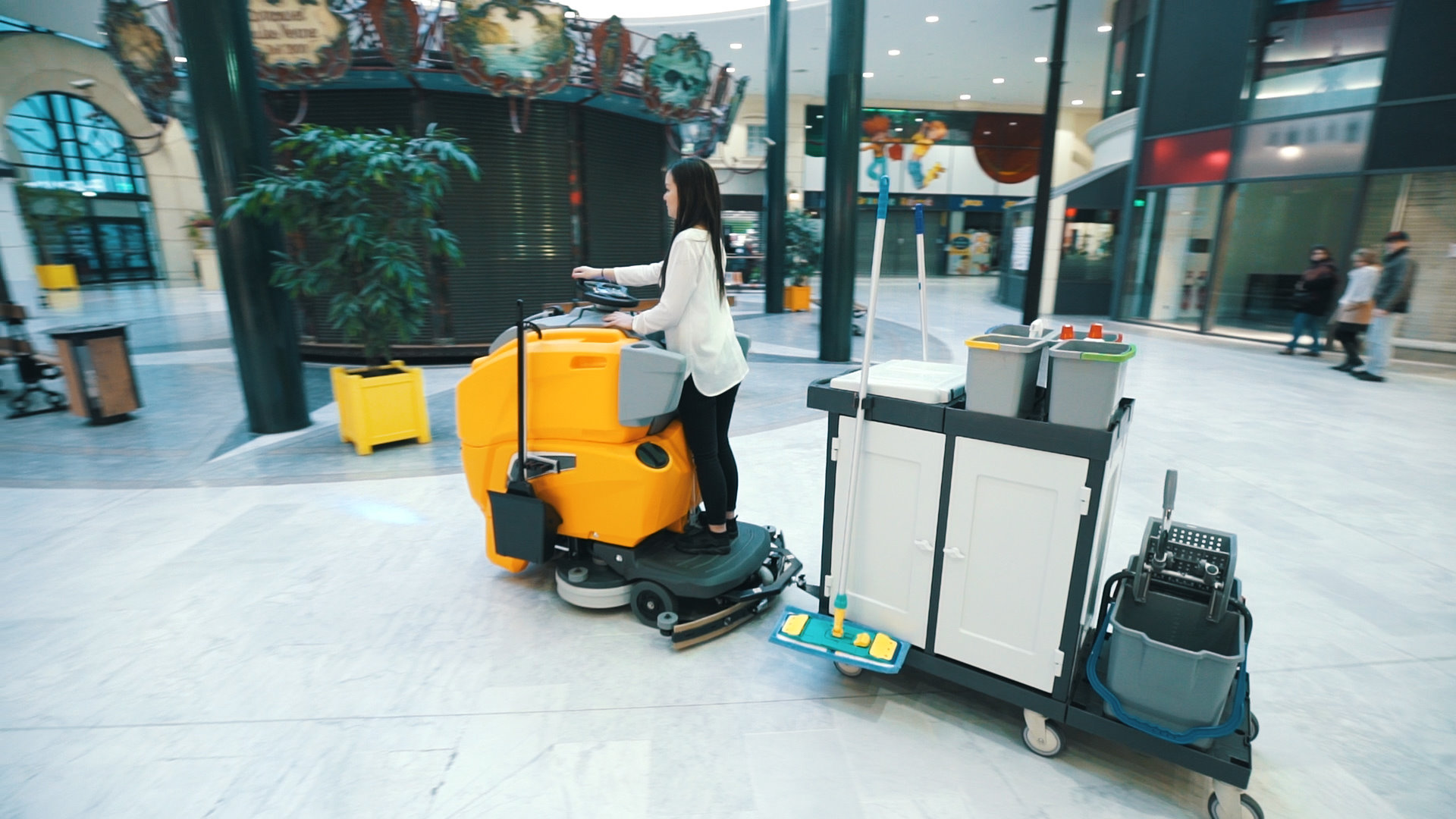 thought about providing it QUARTZ scrubber with the possibility to assemble a hook to carry a trolley for brooms and tools. There will be then the need for just one operator, who can move from an area to another in a quick, safe and comfortable way. During the shifts, when cleaning the bathrooms, the trash bins and the cleaning of the common areas, the operator will be able to keep cleaning the environment with our scrubber.