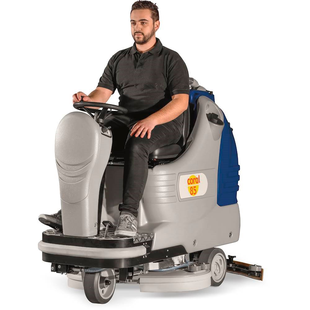 Opzit schrobzuigmachine, compact, 24V accu's aangedreven en voorzien van een dubbele tegengesteld draaiende borstels borstelbasis met twee motorreductoren en een reinigingsbreedte van 85 cm of het andere model met een reinigingsbreedte van 65 cm.